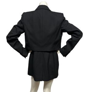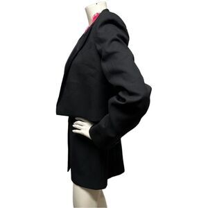 Measurements (pink lace is stretchy / sheer): across bust of pink lace 17.5" to 18" flat/pulled taut pit to pit, across waist of inner piece (where lace meets black tux "bottom") 15.5", across hip area of black bottom part approx 20", across bottom hem of black tux "bottom" approx 22", across back of jacket shoulder seam to shoulder seam 16", length of longer piece 30.5" - back collar of jacket to bottom hem of inner piece, sleeve of jacket 26" from shoulder seam to cuff.