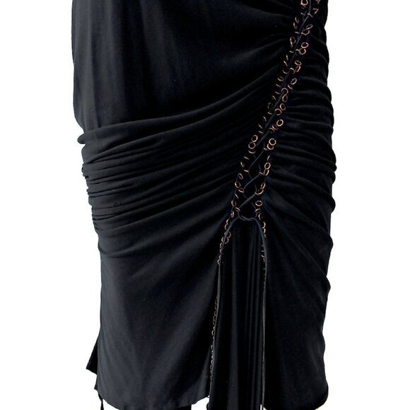 A rare find from beloved Alexander McQueen featured on the Fall ‘02 Runway, his "Supercalifragilistic" black silk knit skirt with asymmetrical hem and dramatic draping at front and back.