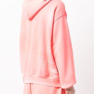The hoodie is sewn from natural cotton and presented in pink color. The model has a loose fit, long sleeves with cuffs, a hood and a large kangaroo pocket. The product is decorated on the front with the branded inscription "ALEXANDER WANG".