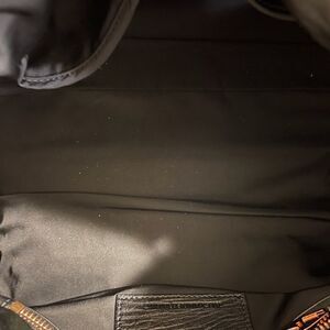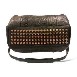 AUTHENTIC ALEXANDER WANG Pebbled Lambskin Rockie in Black and Rose Gold Hardware. This handbag features a duffle silhouette and is crafted of richly textured lambskin leather in black. The bag features short leather top handles, an optional shoulder strap, and a rose gold metal studded base. The top zipper opens to a black nylon fabric interior with zipper and patch pockets.