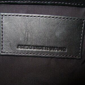 Stylish offering from Alexander Wang, this piece is made with thick pebbled leather with a smooth leather flap and base. Polished rose gold hardware accents. Adjustable leather straps. Large main compartment has a zip pocket, and there's a larger side zip pocket on the outside. Belted drawstring strap and flip catch closures ensure security. Sturdy rolled leather carrying/hanging handle. Retail: $1050.