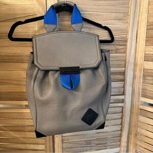 ALEXANDER WANG Prisma leather backpack,. The design boasts no external pockets but features an internal pocket. IIt is crafted from a combination of leather, nylon, and suede. The bag comes with a dust bag for safekeeping.blue straps