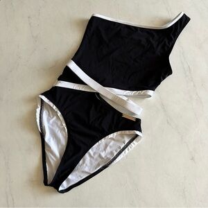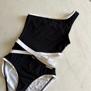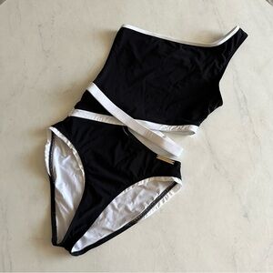 Design: A one shoulder one piece swimsuit with cut out details and contrasting trims.
