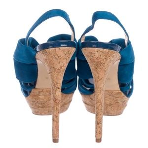 Beautiful Alexandre Birman blue suede platform slingback sandals with cork covered heels. Soles show minor wear from being gently loved. Other than that, in excellent condition and the blue suede is as vibrant and luxurious as if newly.out of the box. Heels measure approximately 5.25" and platform is approximately 1.25". Really beautiful and comfortable shoes which can be worn for an event or with a cocktail dress or mlre casually with jeans and a tank or jean shorts and a flowy top.