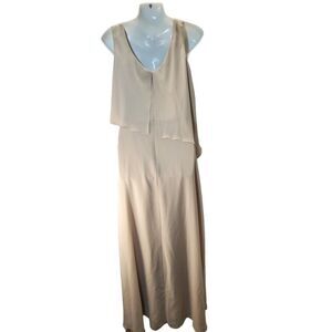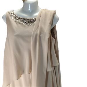 This is the dress everyone means when they say 'Wear something classy." Sleeveless embellished evening gown with a sheer scarf, 2 pc. set. Nice neutral color, longer in back in EUC and measurements shown. That third measurement is the scarf.