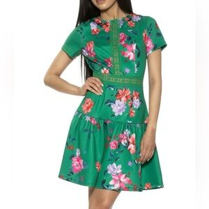 ✨ New with tags!* ALEXIA ADMOR | Alexa Green Floral Fit & Flare Mini Dress- tiered with short sleeves, back zip, and lace insert detail.