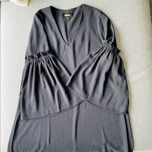 Lovely V-neck black dress with detailed ruffle trim on bell sleeves.