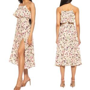 Sleek and stylish dress with a flowy ruffle that cascades from the neck and thigh slit opening, adding a bit of drama.