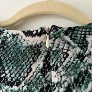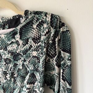 Green python print jersey (95% Polyester, 5% Spandex). Hourglass. Crew neck. Long sleeves. Pull on. 35.5" from shoulder to hemline. Imported.