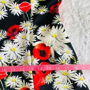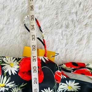 On-trend shoulder cutout design enhanced with daisy print. Squareneck. Spaghetti straps. Cold shoulders. Popover layer. Back zip closure. About 34" from shoulder to hem. Polyester/spandex. Machine wash. Measurements are flat and approximate. Smoke free home
