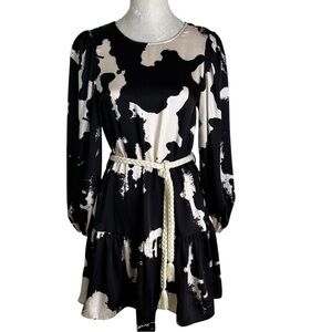 ALEXIS Abstract Long Sleeve Rope Belt Tiered Mini Dress Black and Cream Size XS