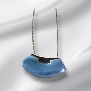 Stunning handcarved lucite pendant in dazzling 'Bermuda Blue Sky'. It can vary in color from blue to light blue-green, depending on the lighting. The necklace, a gold caped chain, extends 16" with a 2" extender for comfort. The unusual shape of the lucite pendant, accented with a silvertone collar, is exquisite, typical of Alexis Bittar designs. The brand cartouche is afixed to the backside. I did not purchase this piece, but I received it as a gift. I admit that I wondered why the designer combined silvertone with a capped gold chain. I am guessing it is a stylistic touch of the designer. Nevertheless, it is a lovely piece of art.