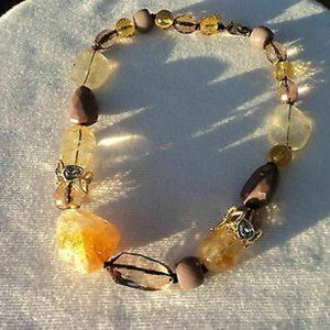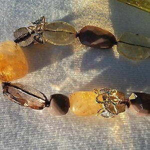 Dyed resin/Swarovski crystal/smoky quartz, amethyst, pyrite, malachite, citrine, glass/gold tone plate