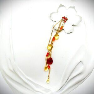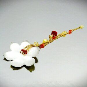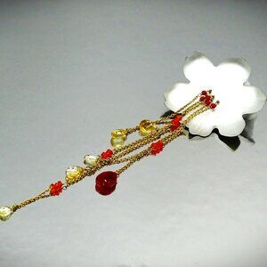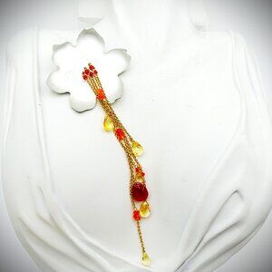 Alexis Bittar yellow gold plated metal, pearly white Lucite and genuine citrine, carnelian, and coral tassel hand carved brooch/pin is approx. 2" wide at widest point, approx. 6" long with pin clasp.