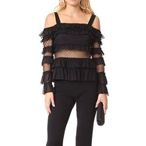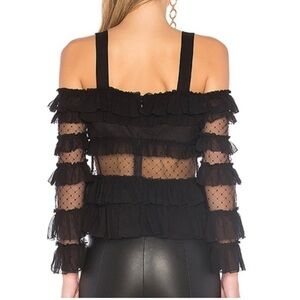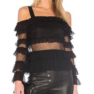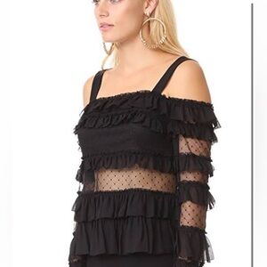 ALEXIS Black Ruffle Mesh Swiss Dot Panel Off the Shoulder Top