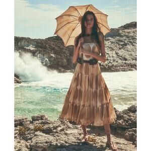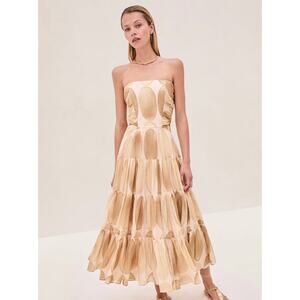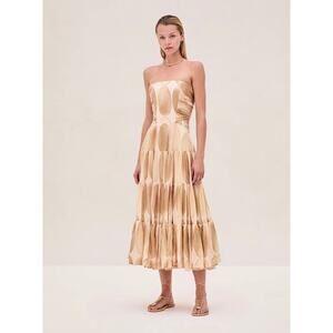 The Dawne Dress is a printed, strapless midi featuring boning accents for structure and a tie-back detail.