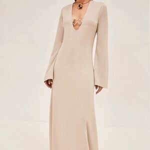 Boasting a low-cut keyhole neckline, gold hardware accents, flared sleeves, and champagne-hued fabric, the dress is very 70s-inspired. The fabric is also very very slightly sparkly. In perfect condition, price is negotiable.