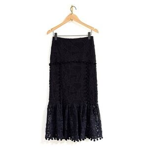 The Femka Skirt is constructed in embroidered lace with crochet pom-pom trimmings. The ankle-length silhouette features a sheer lower panel that shows off the intricacies of the fabric