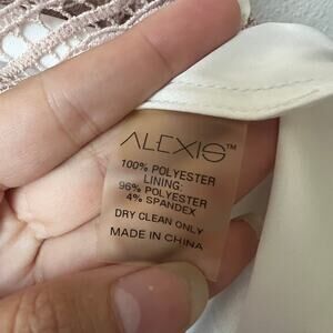 Pristine with a preppy finish, the Alexis 'Melania' Dress was made for daytime dates. Featuring allover embroidered lace, a muted color palette aids in a springtime feel that's paired best with simple heels. Dry clean only. Fully lined. Zipper closures. Scalloped edges. Embroidered lace overlay. Size small - 16" pit to pit; 13.5" waist; 36" total length.