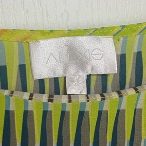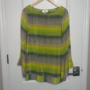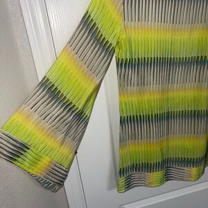 ALEXIS Neon Green Grey Yellow Print Bell Sleeve Tunic Dress Pockets 100% Silk XS