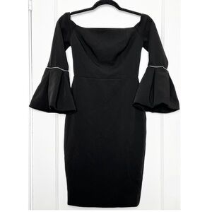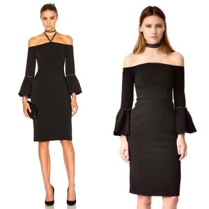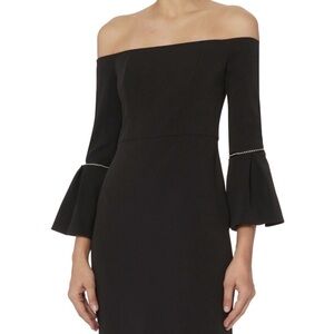 ALEXIS Off Shoulder Embroidered Trim Flared Bell Sleeve Crepe Sheath Dress XS
