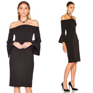 A dashing addition to the refined woman's wardrobe, this elegant dress by Alexis features an off-the-shoulder silhouette with ribbon-trimmed bell sleeves that graze the wrists and add structure to this modern sheath.