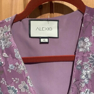 Alexis Shanice floral jumpsuit with floral pattern. Removable clip in fabric to cover v neck. Otherwise you can wear them as a v neck. Tie waist with cut out and ruched waistline. Flare, flowy legs. Comes with a matching scrunchie! No callouts to note! Stock photo added for reference from the website.