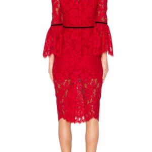A sultry mix of daring and delicate, the Odette dress by Alexis is a statement all on its own. Sweet velvet ties and belled lace sleeves mark this piece as one to wear to amp up the romance.Mint condition! Worn once for a Christmas party. The off-shoulder red lace dress is a halter-strap midi length stunner! Delicate eyelash trim accents the scalloped hem. Hidden Center back zipper. Fully lined. Shell: 61,6% cotton, 20,8% nylon, 17,6% rayon. Lining: 96% polyester, 4% spandex. Dry clean.