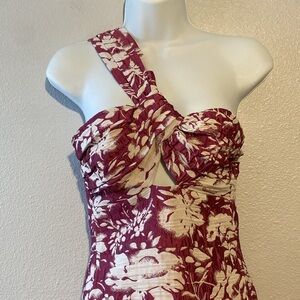 Opulently embroidered into a floral jacquard design, this sheath dress flaunts a provocative cutout and a single shoulder strap.