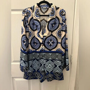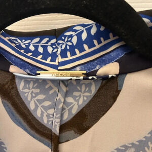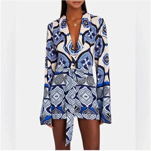 Tied along the waist below a plunging V-cut neckline, the label's Robbie romper is tailored in their Santorini Mosaic print crepe. Button front closures.