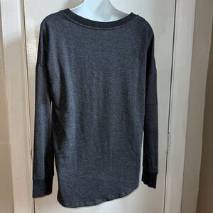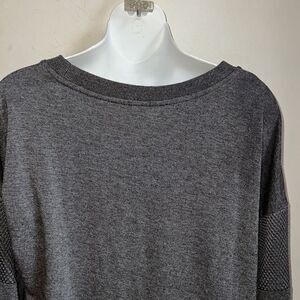 Polyester rayon spandex blend for a super soft feel, long sleeve with mesh panel detail, high low hem, crew neck. Washable, excellent condition. Size Medium, measures 21” from armpit to armpit, 20” from top of front shoulder to bottom hem and 26” from top of back shoulder to bottom hem.