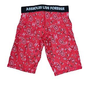 Trendy, shorts, bike shorts, paisley, Y2K, long, Bermuda, workout, activewear, sportswear, assholes live forever, punk, emo, goth, Spencer's, Linda Finegold, lounge, casual,