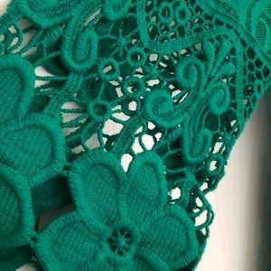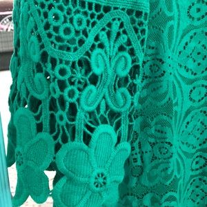 Green crochet designer dress with liner, worn once. 3/4 length crochet sleeves, more midi than mini length exquisite detail