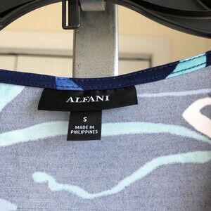 ALFANI BLOUSES TOP TUNIC SIZE SMALL SLEEVELES V-NECK BLUE PRINTED POLYESTER/SPANDEX, MACHINE WASH