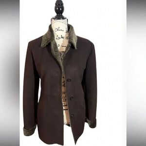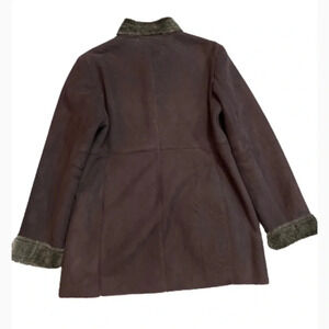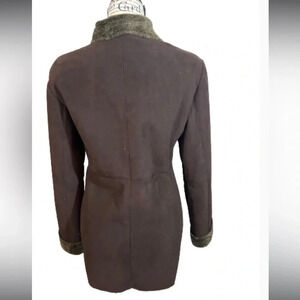Alfani Brown mid length suede like coat soft furry teddy lining and trim front flat pockets 3 front button closure. Very warm and cozy light wear on buttons ( need to tightening) smoke and pet free home measurements in pics