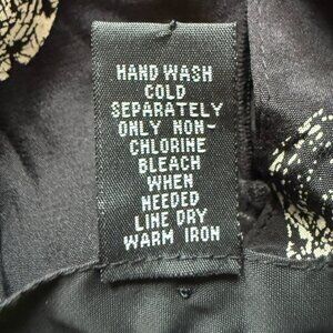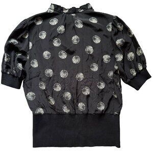 Black women's blouse with short, puffed sleeves and a ribbed, stretch, fitted waistband and cuffs. The blouse features a scattered, cream color circular design. It has a small collar with a bit of a ruffle and a partial button-front.