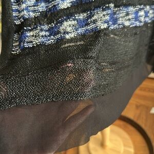 This is a lovely, lightweight scoopneck sweater, with a semi loose knit. It hits below the hips and has a sheer black trim and subtle sequins to make it appropriate for an evening look.