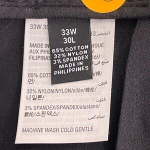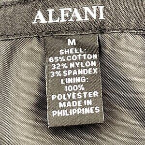 ALFANI Classic Fit Stretch Suit. Pant Size 33W/30L Jacket Size Medium. Nylon/Cotton/Spandex blend gives overall stretch and subtle sheen. Great for more formal occasions! Jacket is single breast, 2 button closure with 3 button cuffs; partially lined; single rear vent flap; hip pockets, one interior breast pocket. Flat front slacks with zip/button/bar clasp closure; hip pockets and rear pockets. Jacket measures approx 21" armpit to armpit, 18" top shoulder to shoulder, 25" sleeves (measured from armhole) 28" shoulder seam to hem. Slacks measure 37" all the way around waist and 18" waist, seam to seam when lying flat, 10" rise, 29" inseam (may be lowered approx 1" more if hem is let out). In excellent condition as it was worn one time.