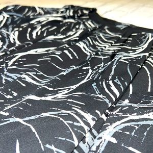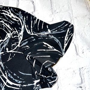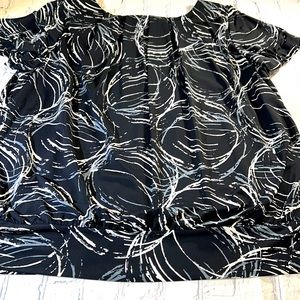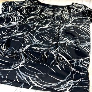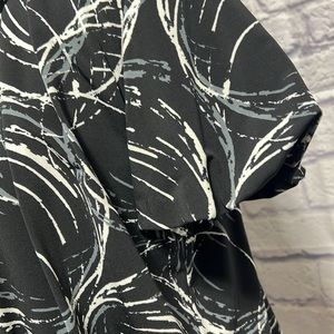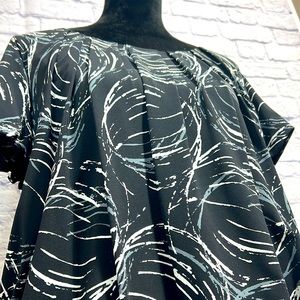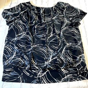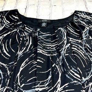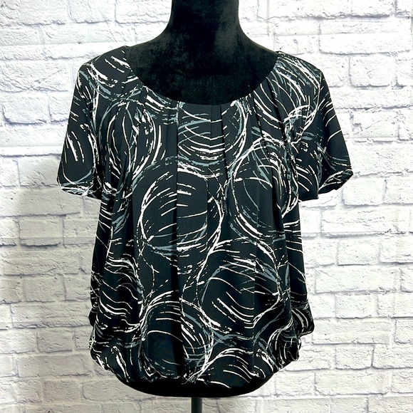 ALFANI Ruched Short Sleeve Top - Black, Gray, Cream. Modern, wear-to-work brand for style & comfort. Scoop neck, short sleeves, banded bottom with decorative buttons (4) on left side, ruched front, back, & sleeves. Lined. Women’s size Large. Approximate measurements: 20 1/2” waist, 21” front to bottom, 24 1/2 back to bottom, 10” neck opening width, 3” neck to shoulder, 7” sleeve length, 19” across bust, 2 3/4” wide waistband. Excellent condition