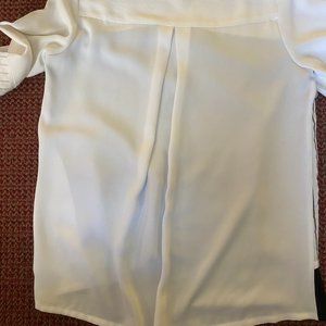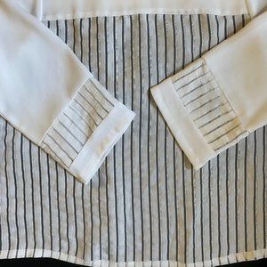 PERFECT FALL BLOUSE. White. The front has a black material panel which is covered with a sheer striped design. The sheer piece is shorter to allow for the 4" black panel to show. 3/4 length sleeves with the same stripe sheer material at cuff. Rounded neckline. There is a center tucked pleat in the back of blouse. Shoulder to hem 27". P2P 21".