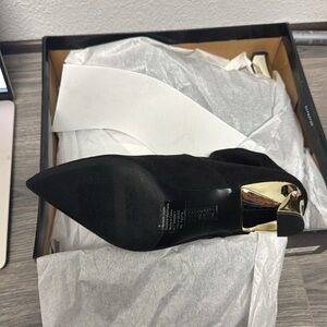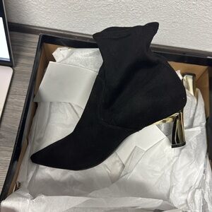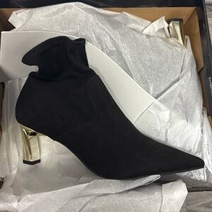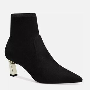 ALFANI Womens Black Metallic Heel Stretch Padded Bambey Pointed Toe Sculpted Heel Dress Booties.