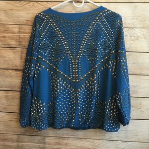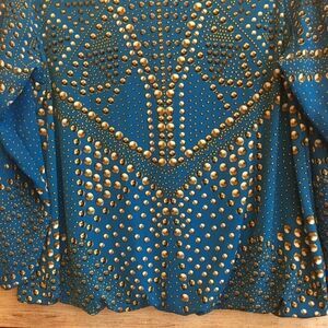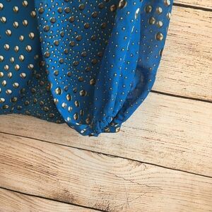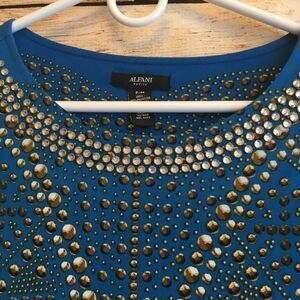 EXCELLENT CONDITION ALFANI BLOUSON TOP WITH JEWELED NECKLINE SIZE PM LINED PIT TO PIT 20 INCHES SHOULDER TO HEM 23 INCHES 95% POLYESTER 5% SPANDEX