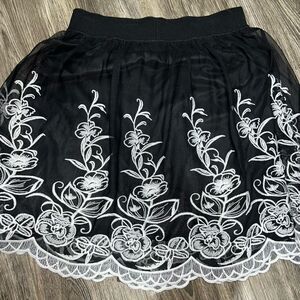 Skirt is lined and has an elastic waist. Details include black mesh overlay with white embroidered flowers and scalloped bottom edge.