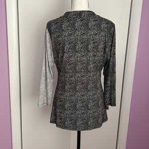 This v-neck Alfini black and white blouse has flattering ruching in front. Circular black and white pattern. Size Medium.Polyester and spandex.