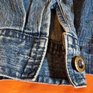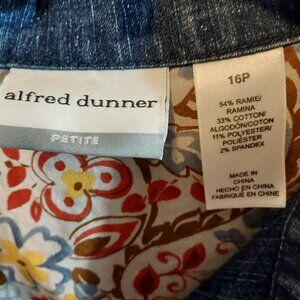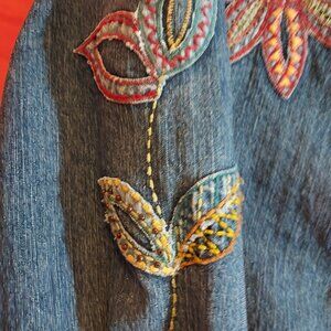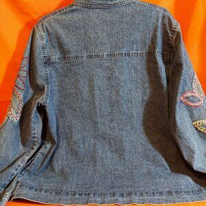 Like New Alfred Dunner Denim Jacket with Colorful Appliques. Size 16 Petite. Straight. Cut Brass Buttons. Buttoned and Pleated Cuff. Large Front Flowers have Beads Also. 44" Chest. 27" Length. 24" Sleeve Length.