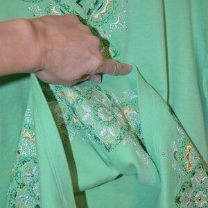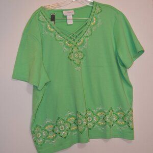 ALFRED DUNNER Green Embroidery V-Neck Crossed Cords Sequences ShortSl Blouse XL