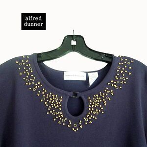 ALFRED DUNNER |NEW| Bohemian Keyhole Beaded Animal Latch Embellish Short Sleeve Knit Blouse Top XL. This is a beautiful Navy color knit top that features a beige bead embellishment around the front neckline. A keyhole is held with an animal print latch. See pictures for all details and Table Chart in the pics to size this blouse. Specific measurements are provided upon request.