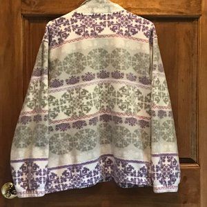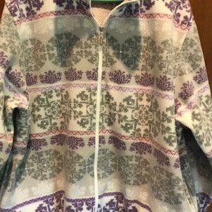 Excellent used condition Alfred Dunner fleece jacket. Zip close, snowflake design in mauve and gray on a light gray and white background. Rhinestone embellishments.