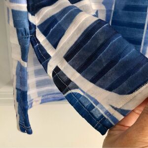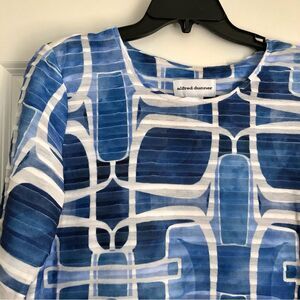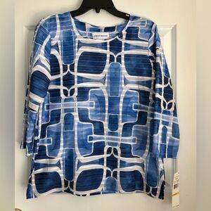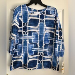 ALFRED DUNNER SIZE SMALL TOP GEOMETRIC RUFFLE CREW NECK PULLOVER CLASSICS BLUE/WHITE 3/4 SLEEVE