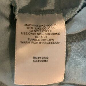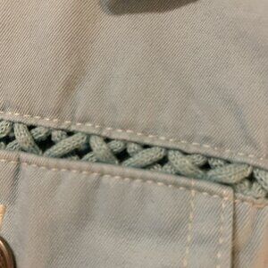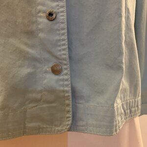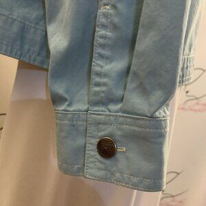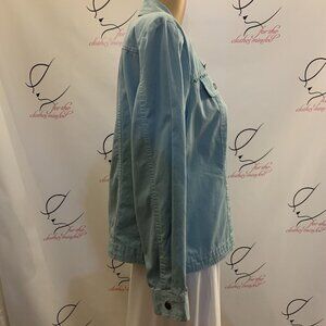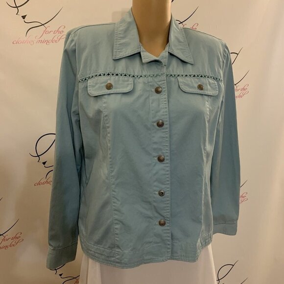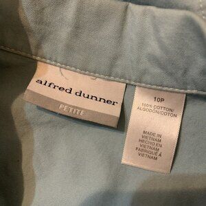 ALFRED DUNNER. Size 10P. Cotton Long Sleeve Cuffed 22.8". Snap Front Jacket. My monitor is showing the color as light blue but it's more of an aqua. Please not pic - next to botton snap is broken. Center back 23". Bust 21/42". (Armpit to armpit X2 - Taken with tailor's tape so could have a bit of play. Please add your preferred amount of ease.) Shoulder to hem 22.4". Machine wash. Inserted embellishment. Shoulder pads.